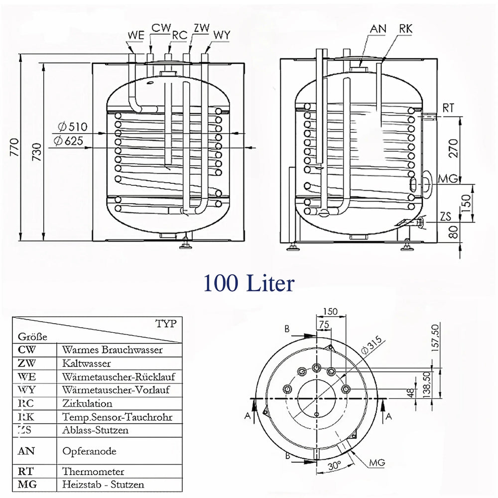 Обем: 100 литра; Площ на топлообменника: 1,2 м²; Капацитет на топлообменника: 5,27 литра. Връзките за подаване, връщане и циркулация са по 3/4" AG, допълнено с 1 1/4" IG връзка за магнезиевия анод и 1 1/2" IG връзка за електрическия нагревателен елемент.